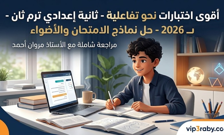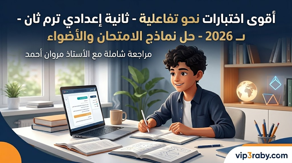 أهلاً بكم أبنائي طلاب الصف الثاني الإعدادي في رحلة جديدة مع مادة اللغة العربية عبر موقعكم التعليمي المفضل VIP3RABY.COM. يسعدنا أن نقدم لكم اليوم مرجعاً شاملاً يتضمن حل اختبارات الامتحان والأضواء بنظام الاختيار من متعدد، والتي تعد من أهم الأدوات التدريبية للتمكن من قواعد النحو المقررة لهذا العام. لقد قمنا في هذا المقال بتوفير الأكواد التفاعلية للاختبارات لتمكينكم من قياس مستواكم وتصحيح أخطائكم فورياً بطريقة مبتكرة وسهلة، وذلك تحت إشراف الأستاذ مروان أحمد، لضمان تقديم مادة علمية دقيقة ومبسطة تساعدكم على التفوق والتميز.
